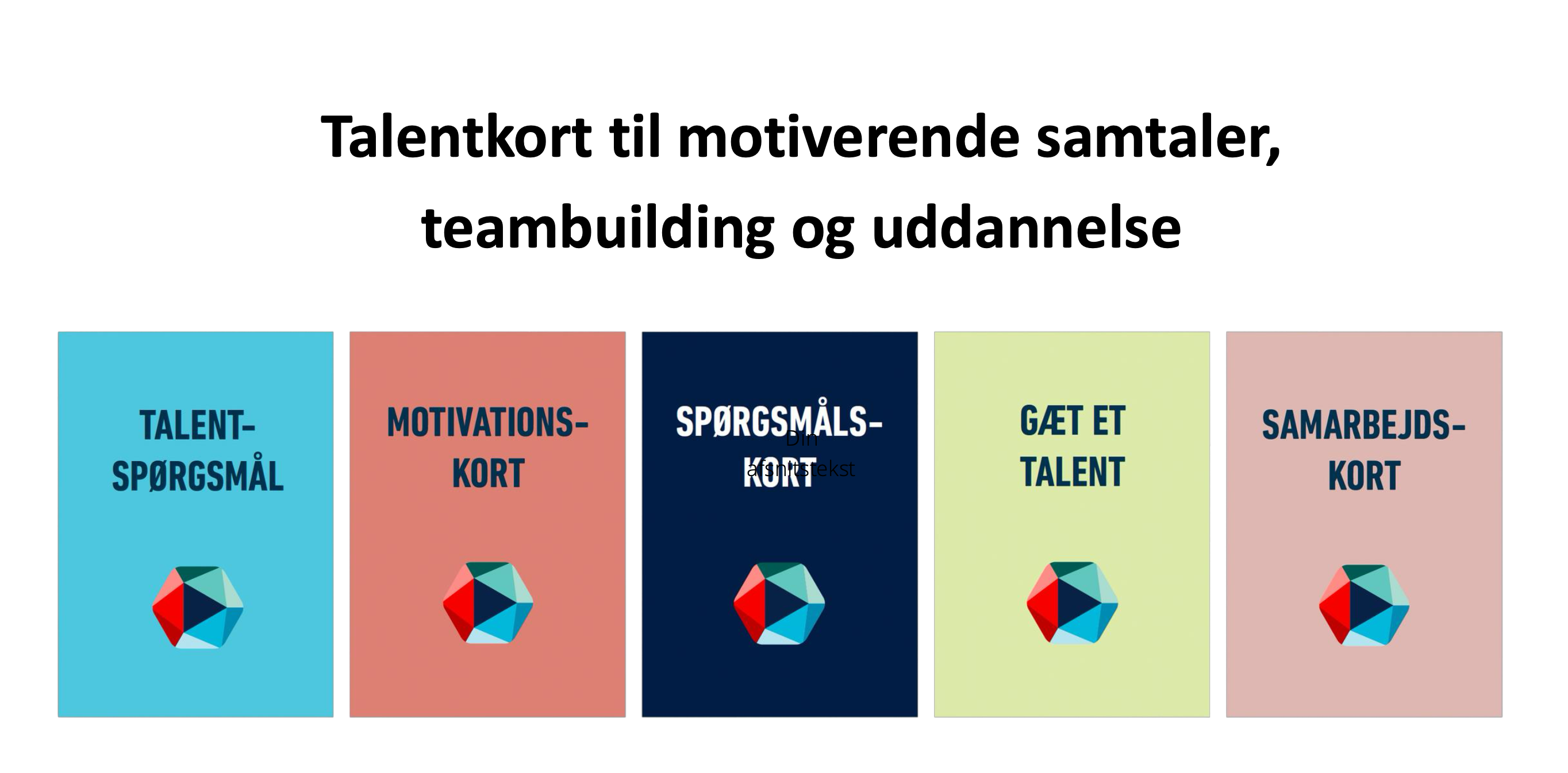Derudover rummer sættet kort, som er særligt udviklet til teambuilding og styrkelse af samarbejdet i teams. Du får også et kortsæt, der kan bruges som vendespil – ideelt til at træne talentforståelse på en legende og involverende måde.